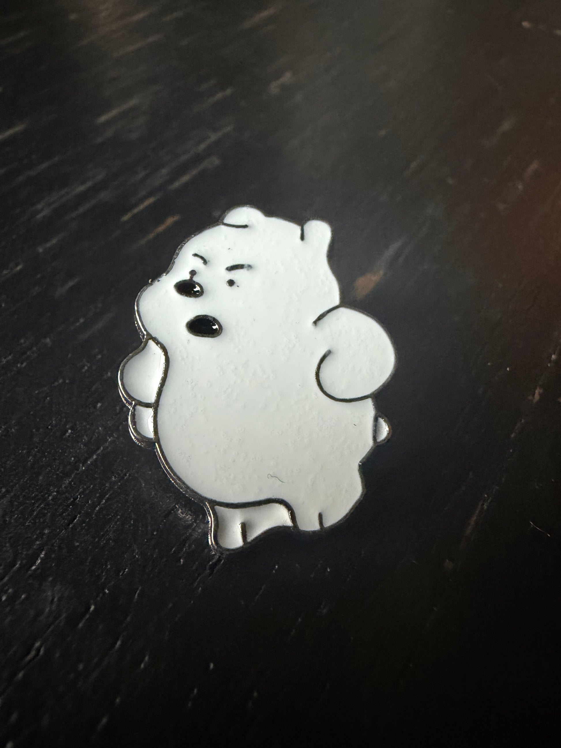 A cute polar bear enamel pin featuring a simple white design with black facial detailing and a rounded shape. A fun, minimal accessory for jackets, bags, backpacks, or pin boards—perfect for animal lovers and pin collectors.