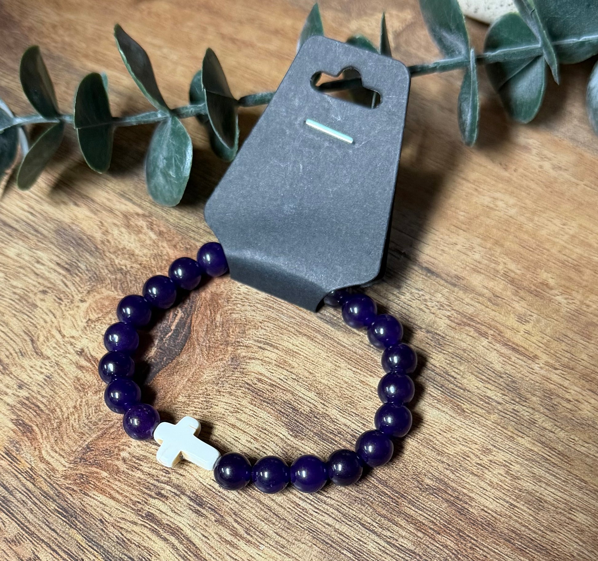 Amethyst Stretchy Bracelet w/White Turquoise Cross