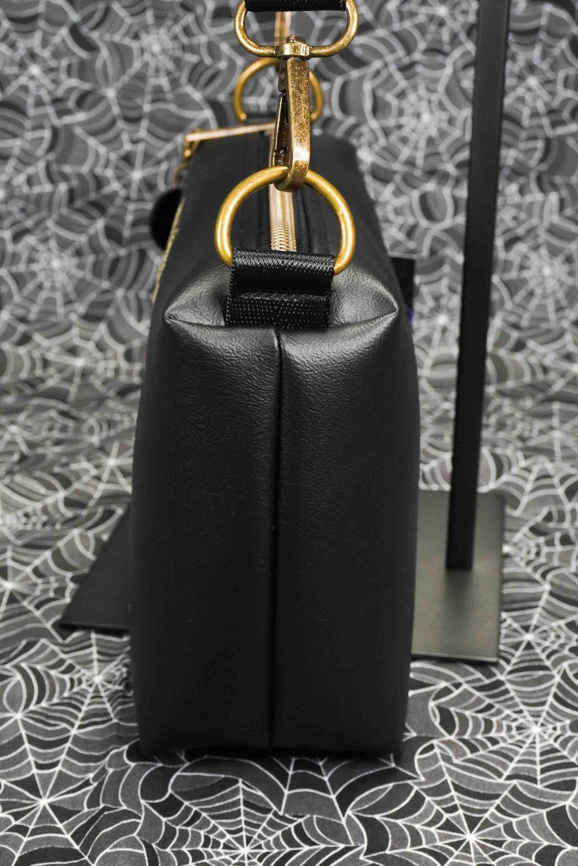 – Vegan Leather, Gold Embroidery, Brass Hardware Channel a little midnight magic with this Black and Gold Celestial Cat Small Crossbody Bag.