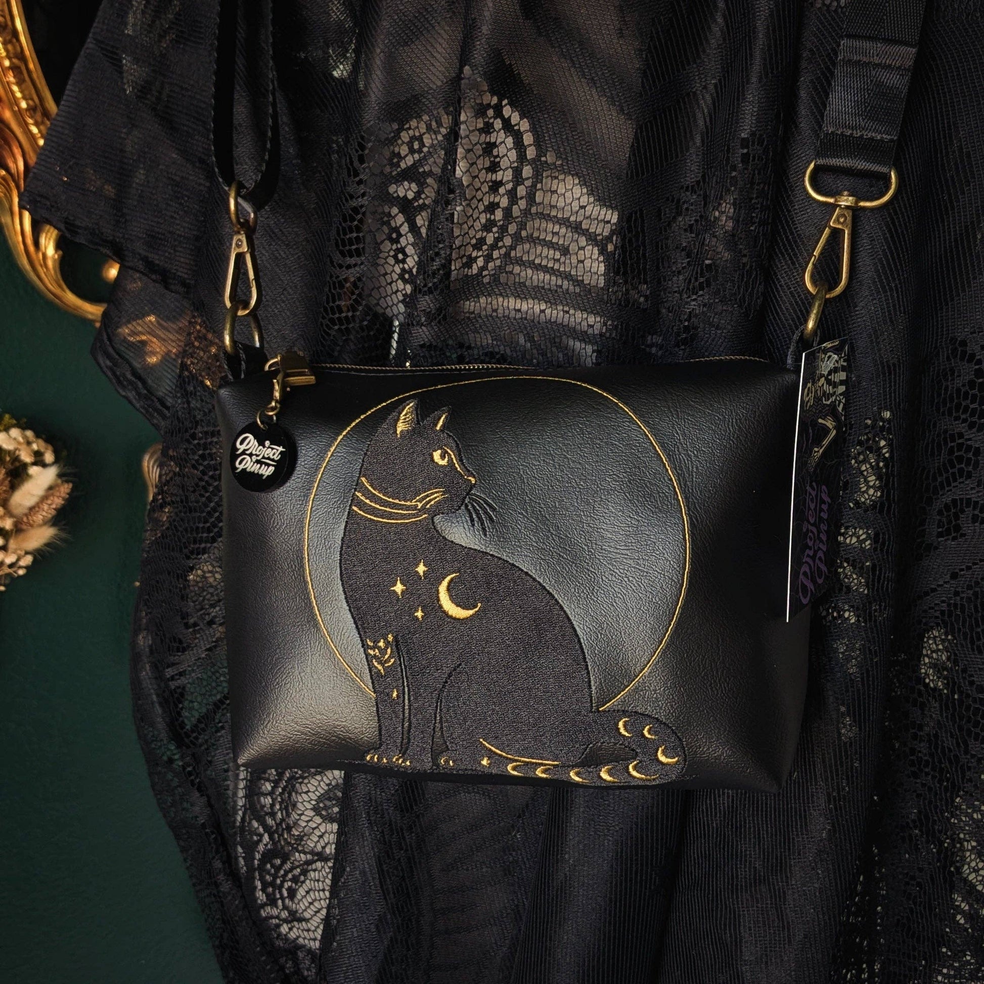 Black and Gold Celestial Cat Small Crossbody Bag – Handmade, Vegan Leather, Gold Embroidery, Brass Hardware