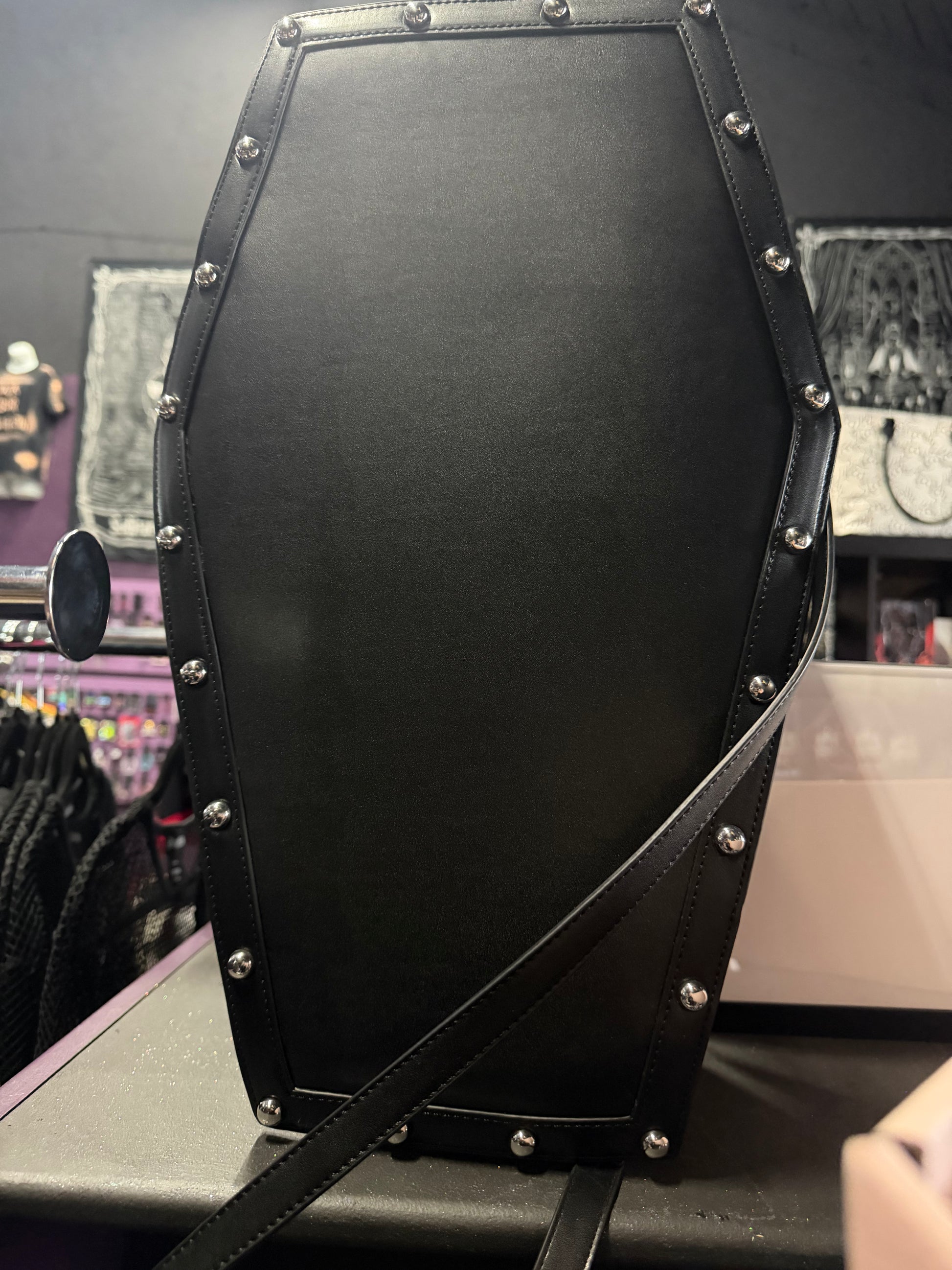This coffin-shaped shoulder bag has a vegan leather construction with goth patches stitched on the front, an embroidered spiderweb, ball stud detailing, an adjustable and removable shoulder strap, and a top zipper closure.