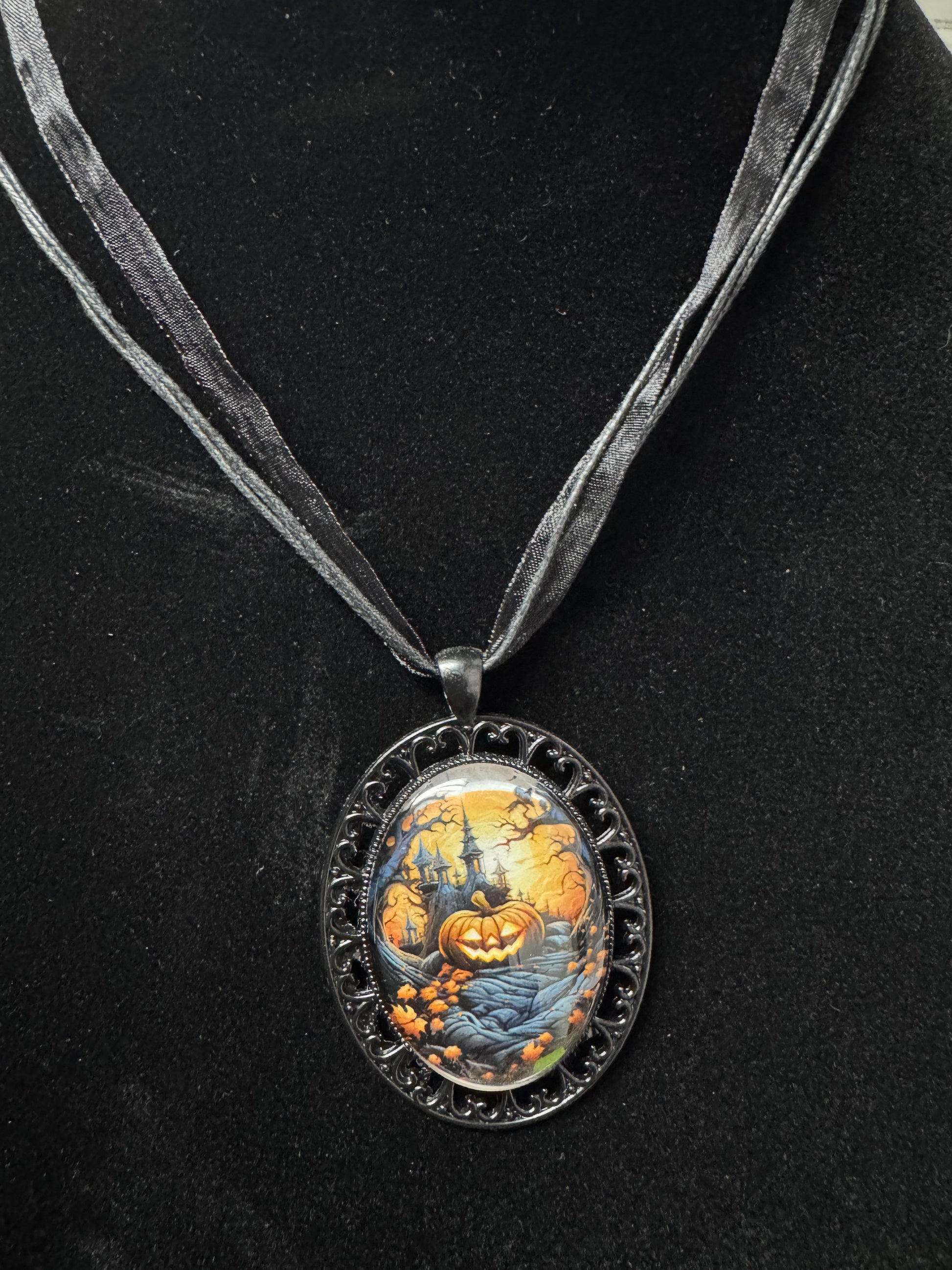 Framed Pumpkin Scene Cabochon Pendant Ribbon Necklace