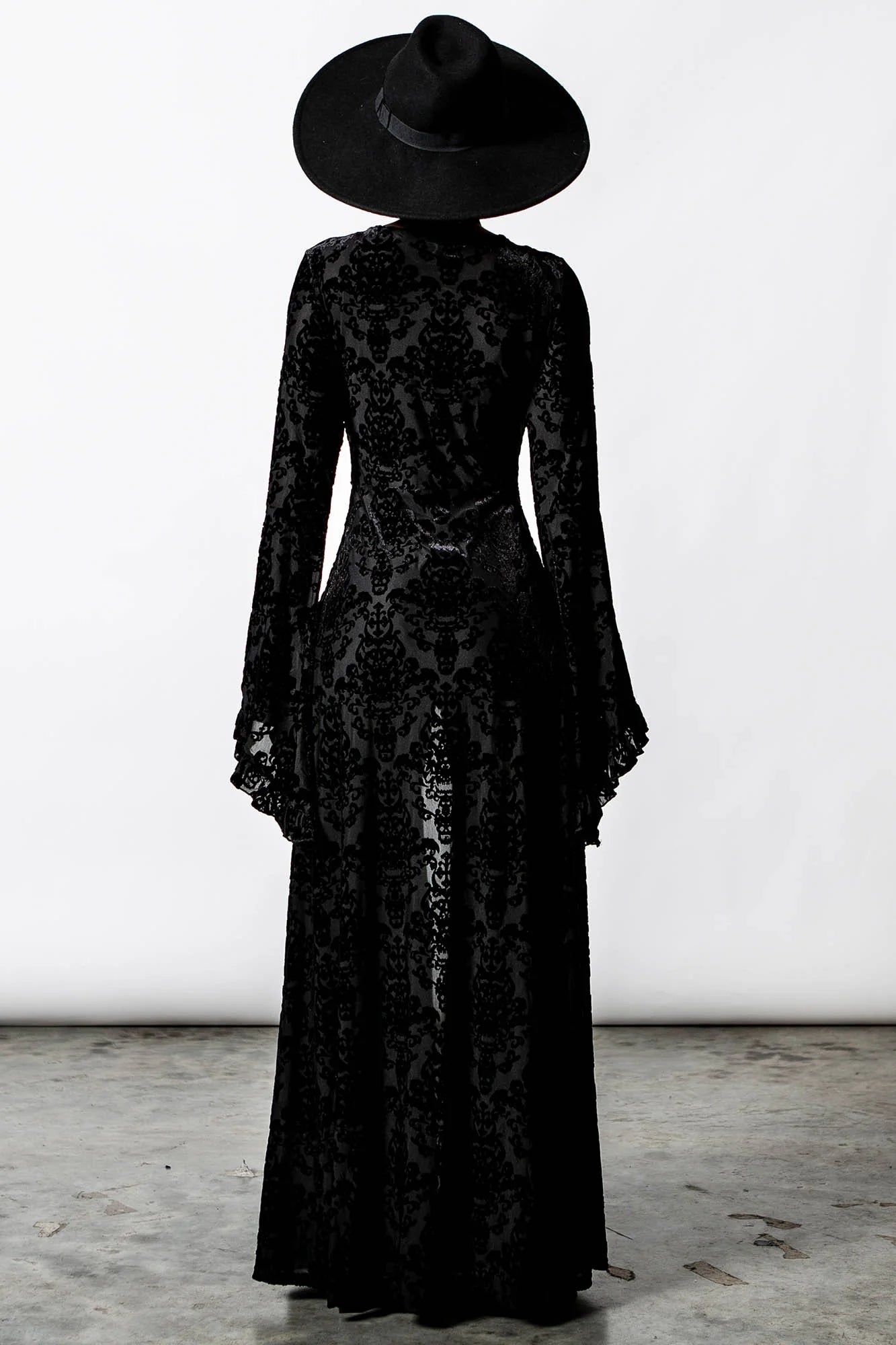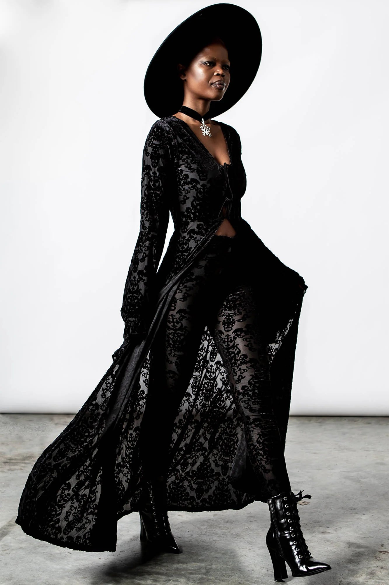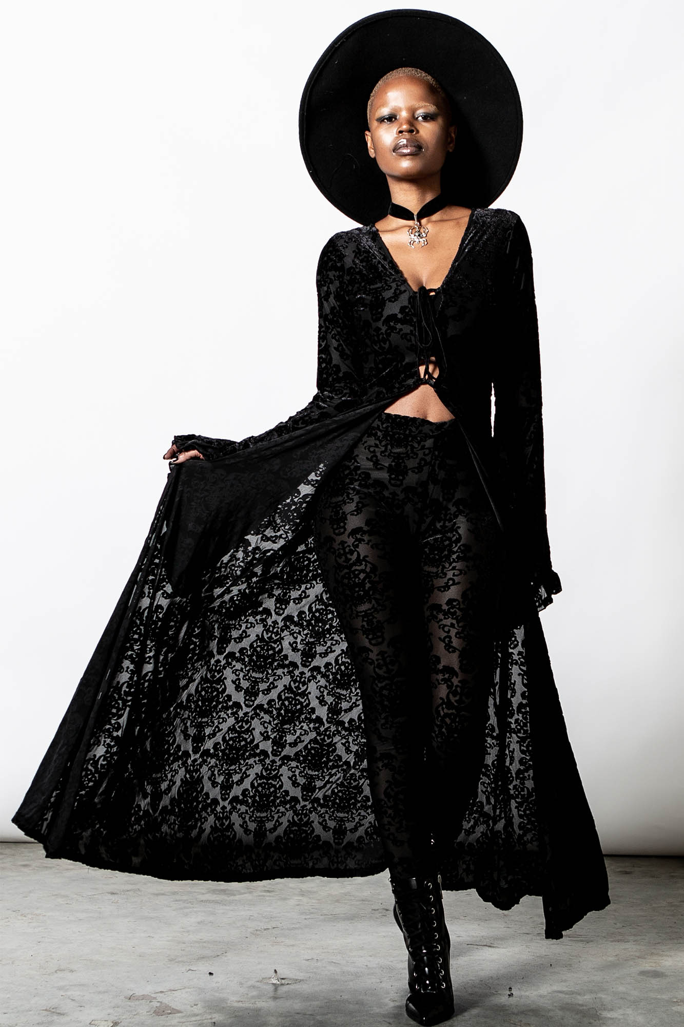 Live your life with unreasonable passion and see the magic that you can create. Feel devilishly seductive in our 'Inferno' velvet duster; conjured using the finest soft-touch velvet which stretches to perfection for a comfortable and flattering fit. No detail has been spared; features a statement pattern all over and dramatic flare sleeves. Complete with a sultry lace-up front and duster silhouette; a witchy lil' statement piece which is a dream to style - perfect for rituals with the coven or picnics by the moon!