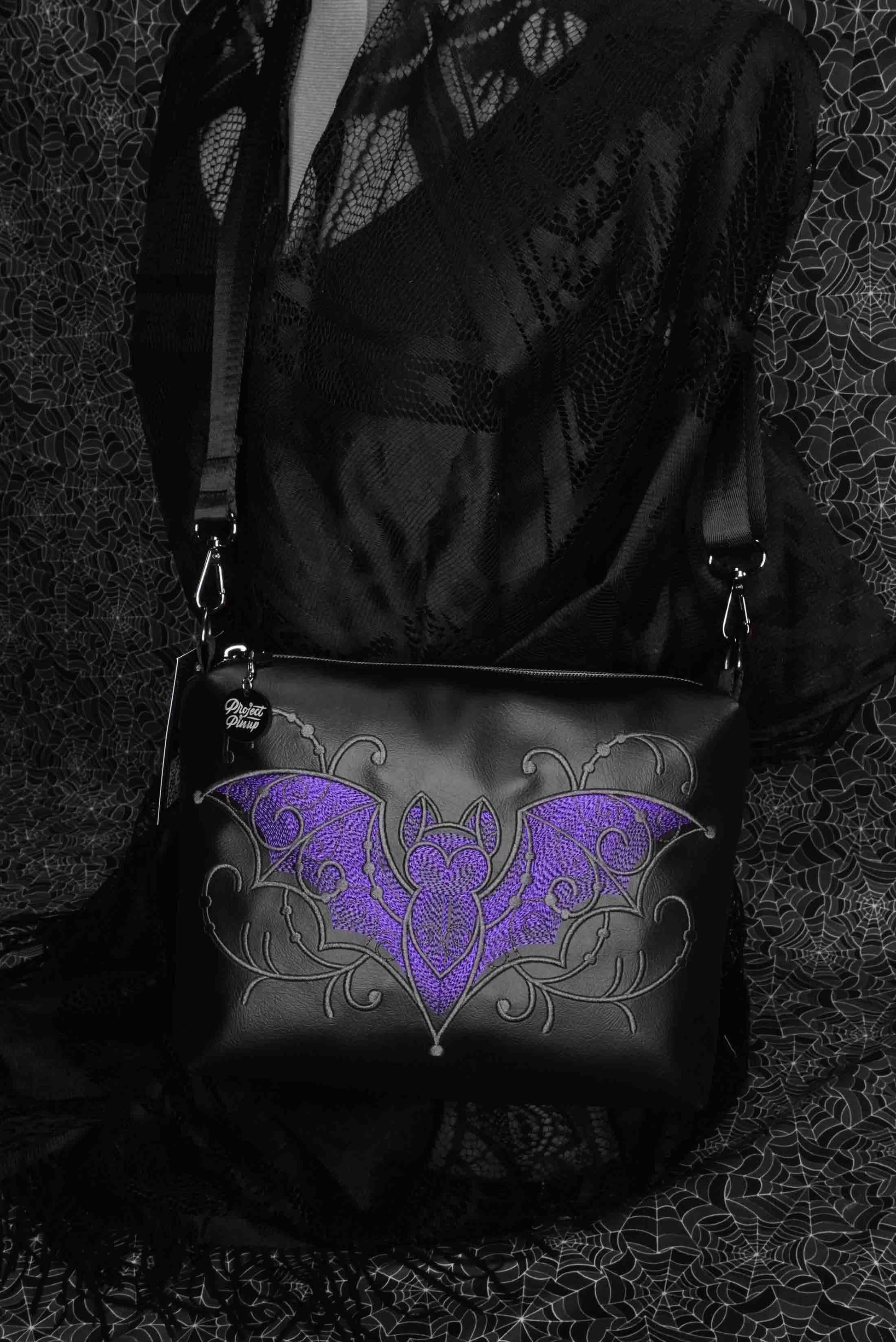 - This crossbody bag features an elegant embroidered bat with filigree wings in vivid purple thread, perched against matte black vegan leather. It’s gothic, graceful, and totally wearable, perfect for spooky babes with a flair for the dramatic.