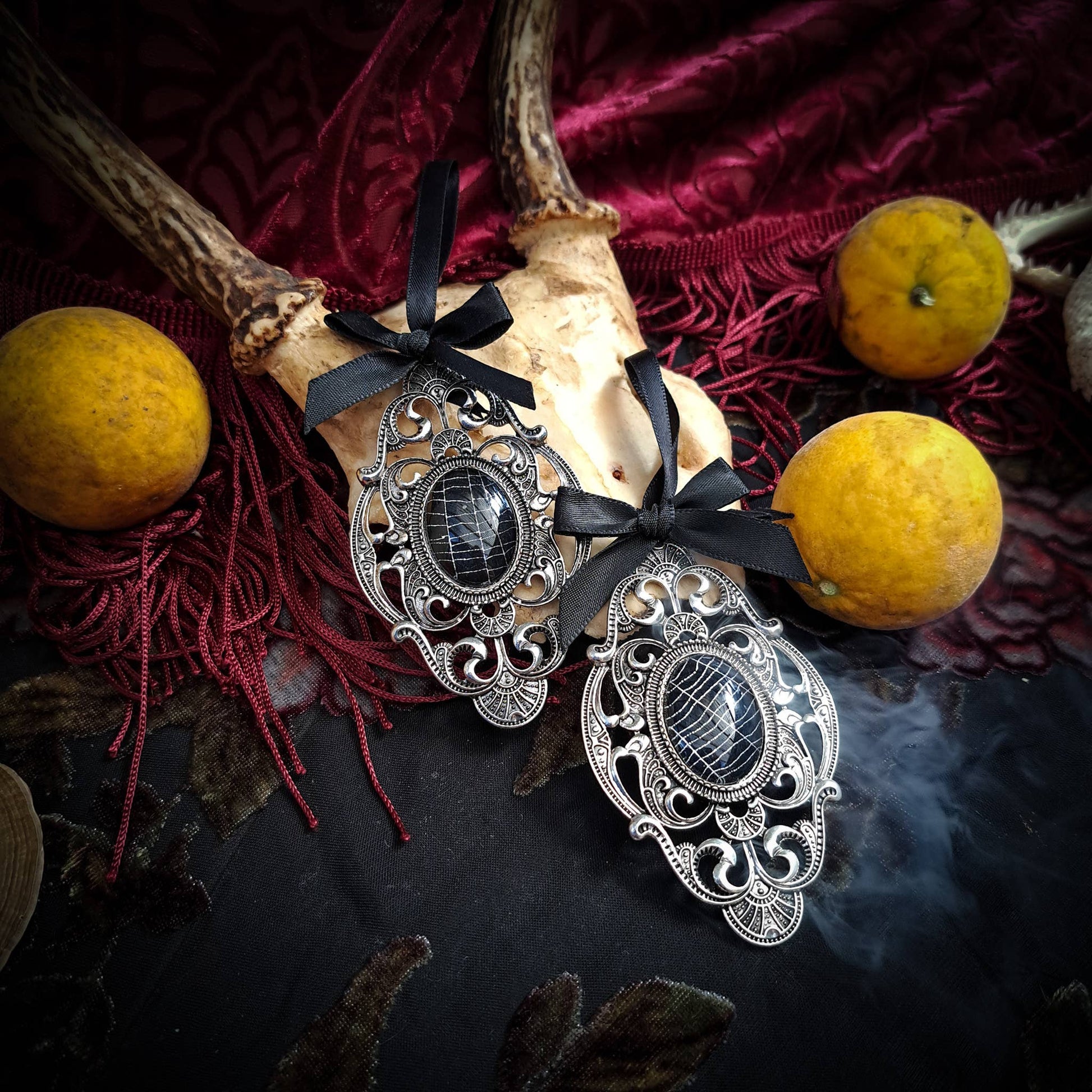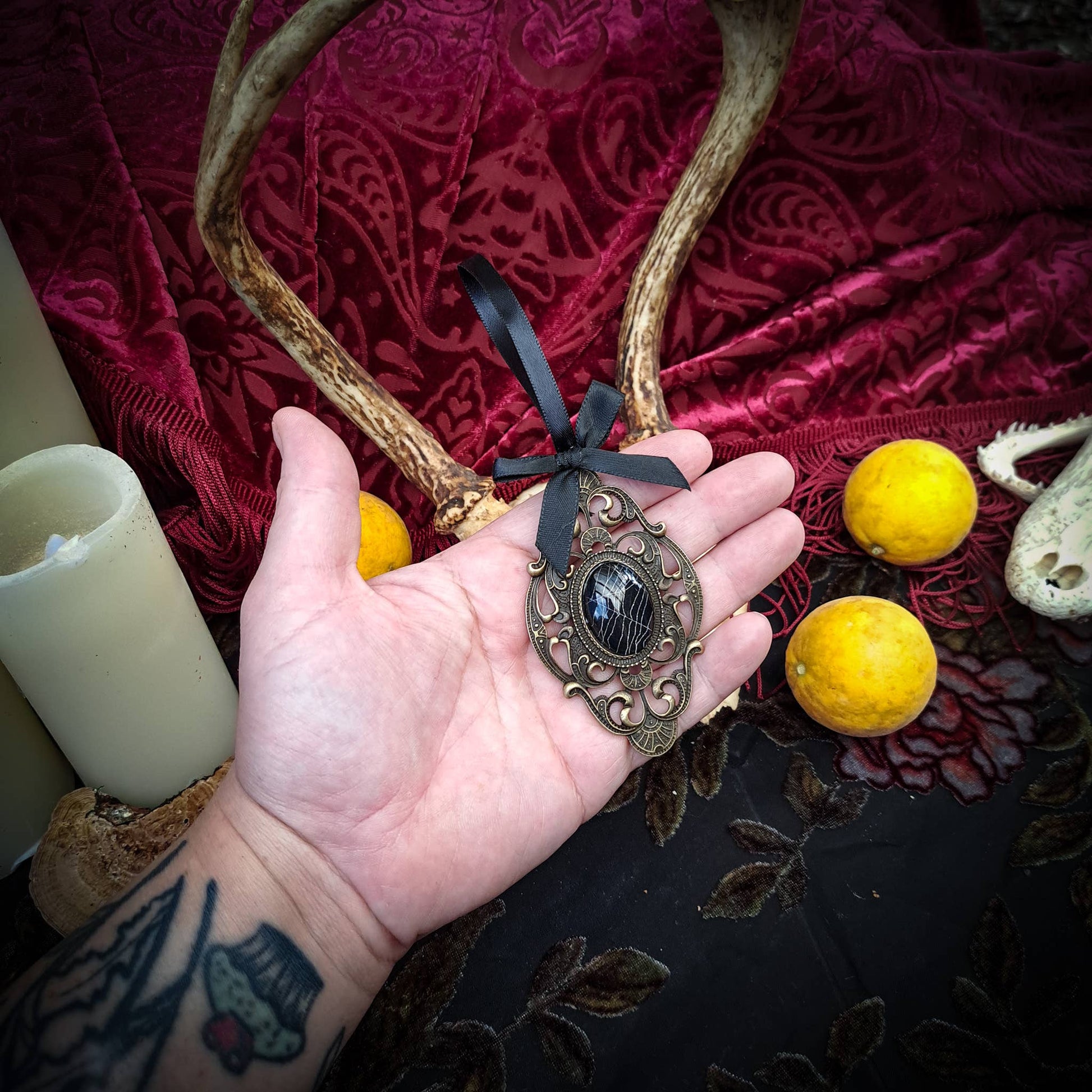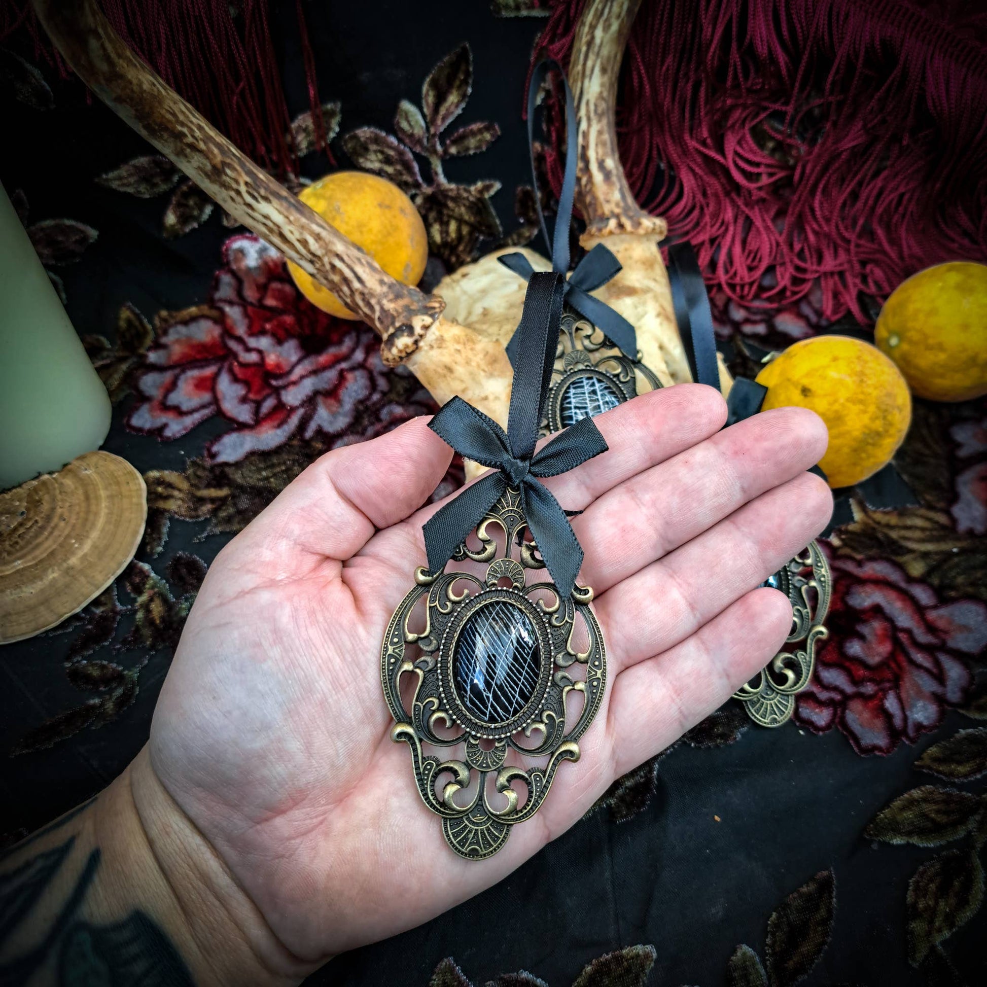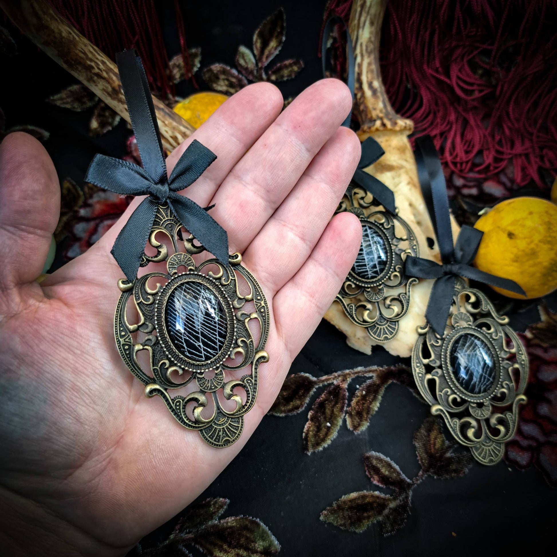 **No Animals are harmed in the making of our jewelry** Spider web set into a Beautiful Filigree bezel in either Black or Antique Bronze.