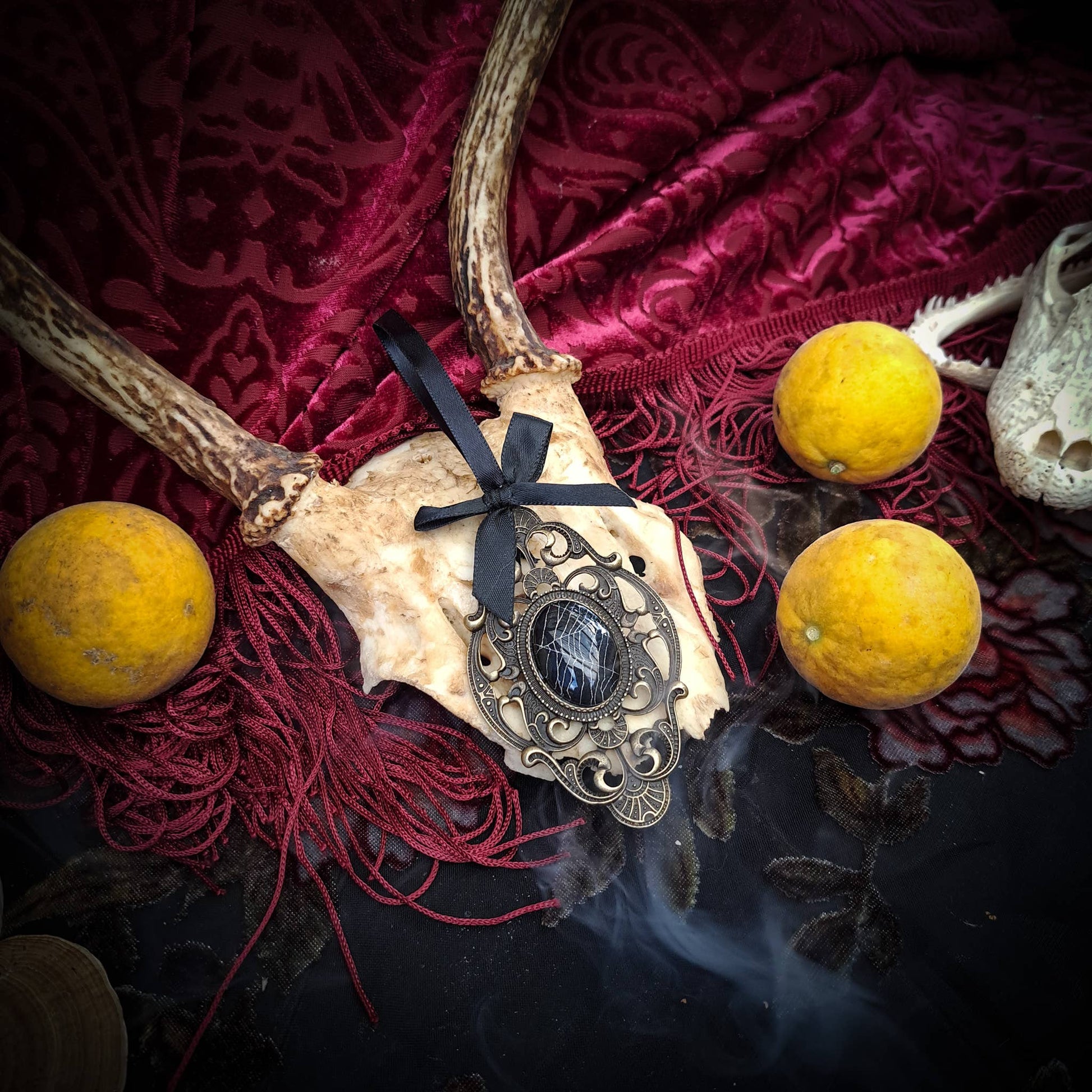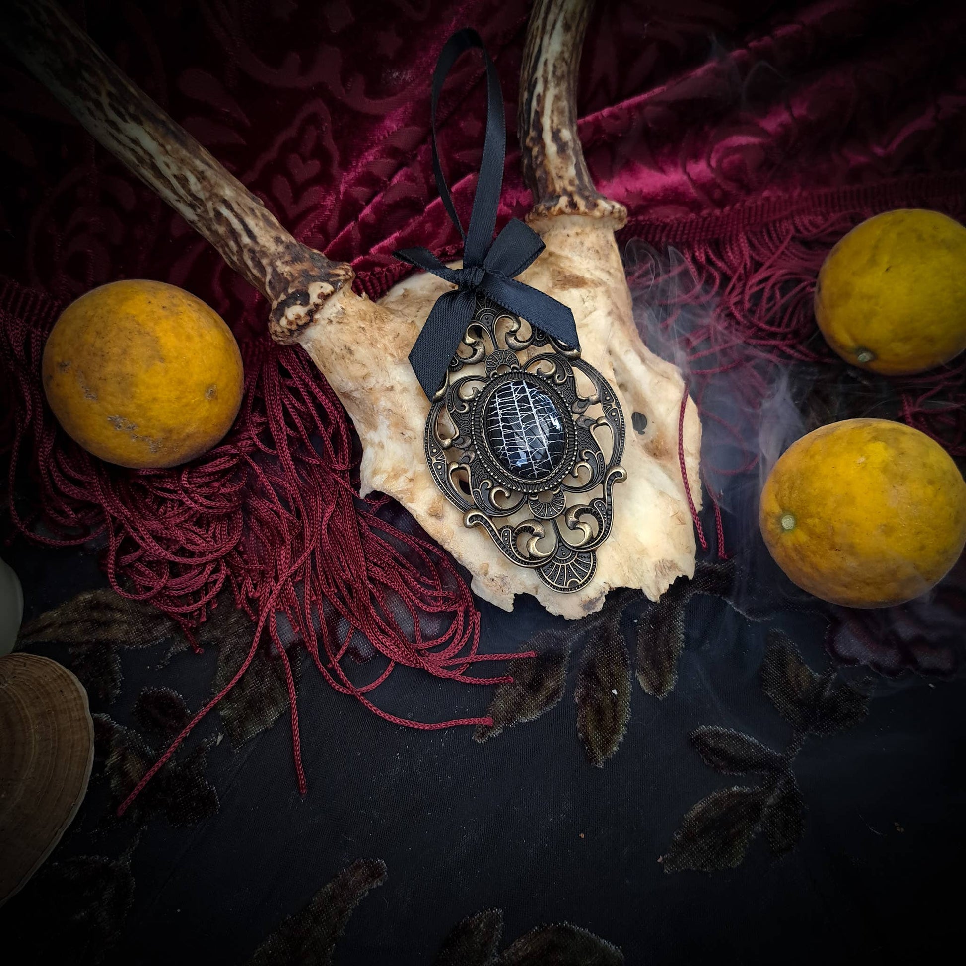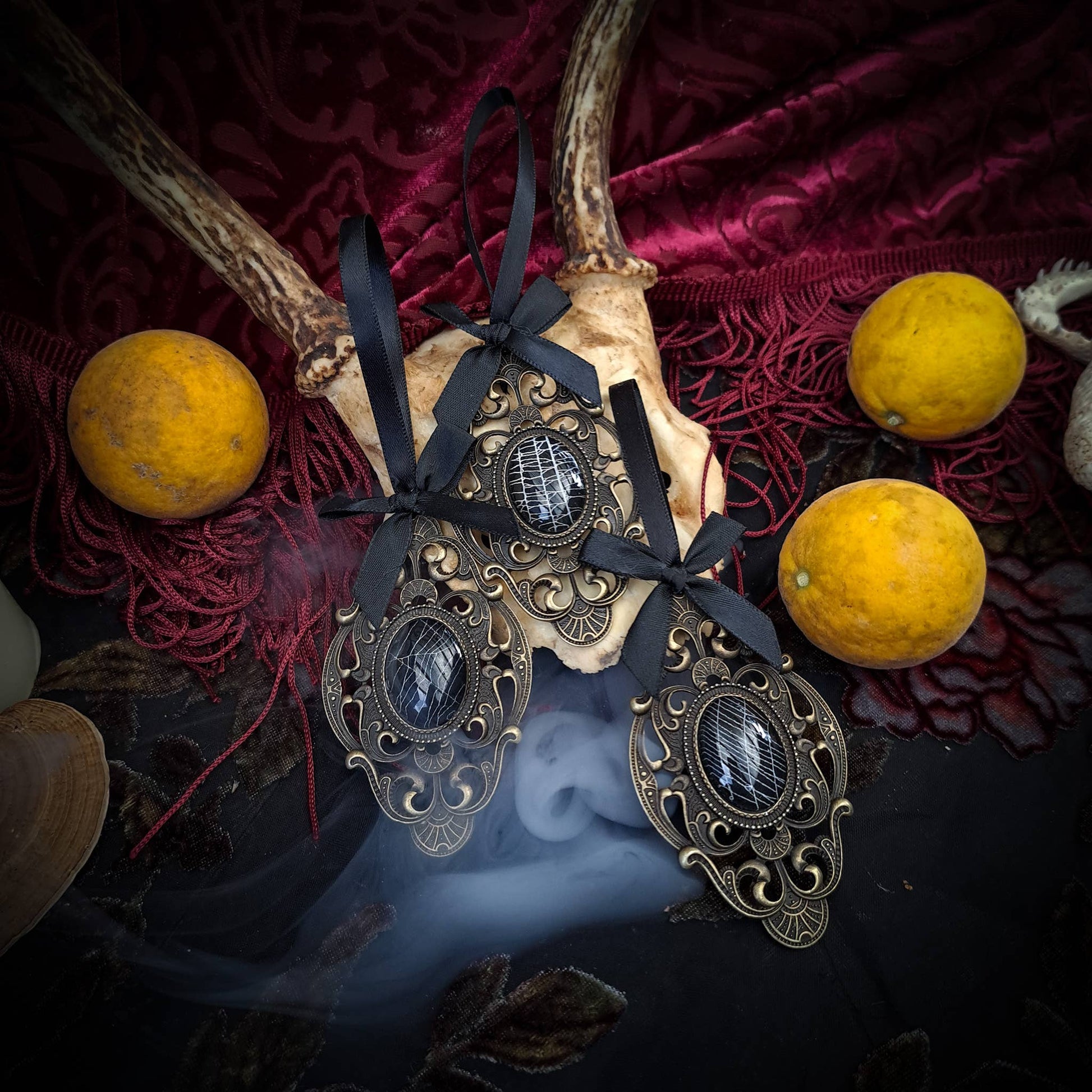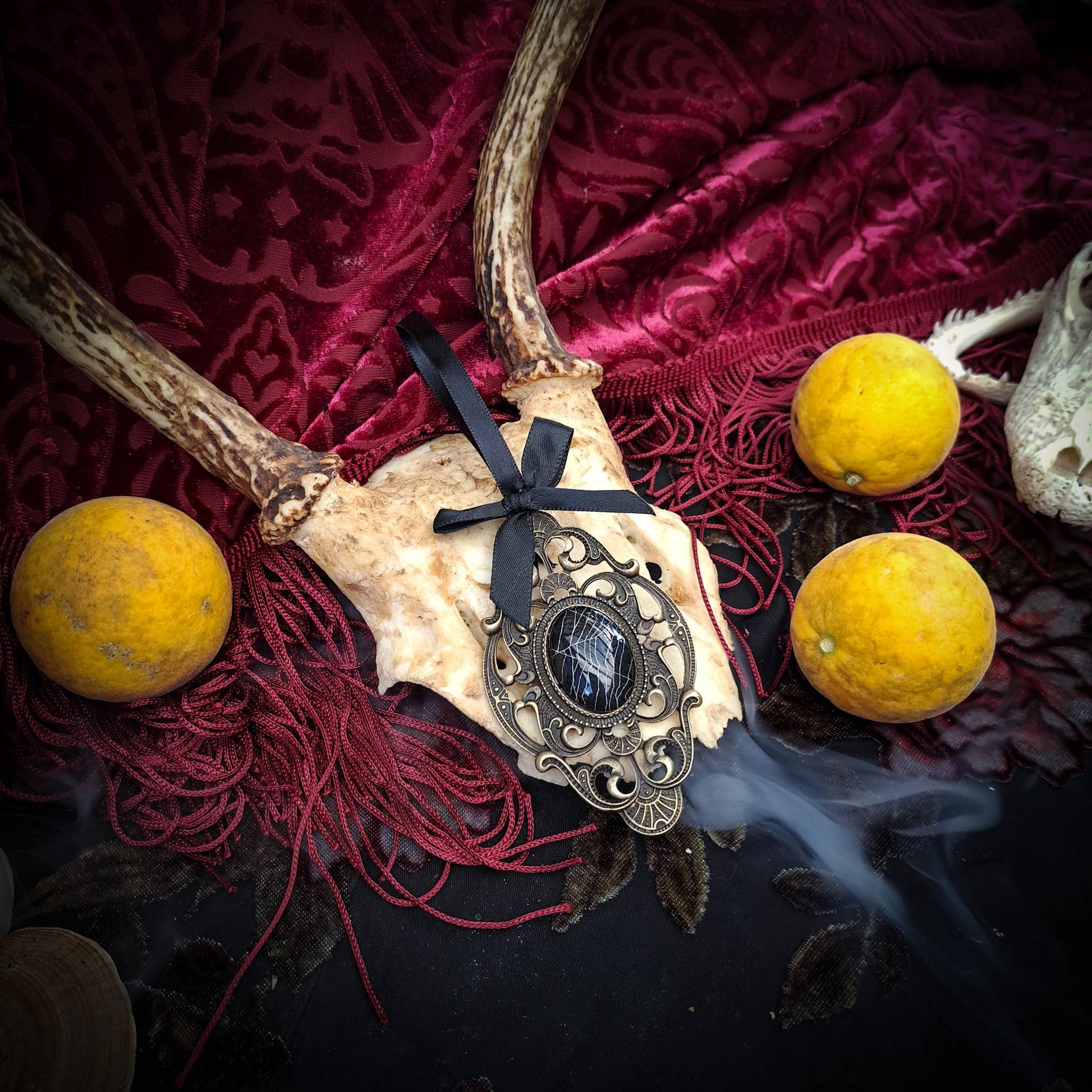 **No Animals are harmed in the making of our jewelry** Spider web set into a Beautiful Filigree bezel in either Black or Antique Bronze.