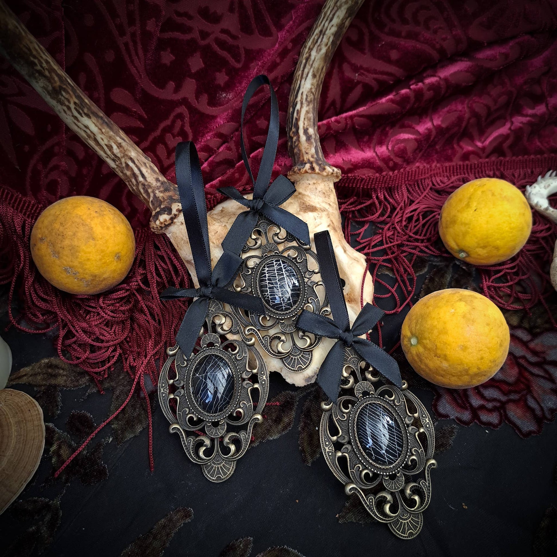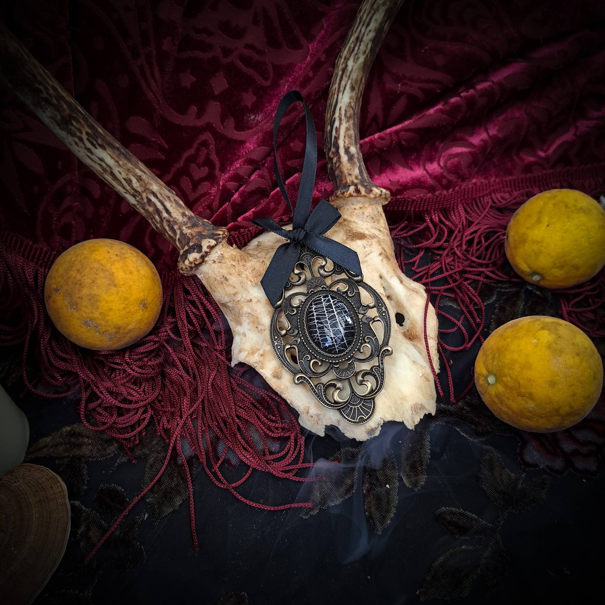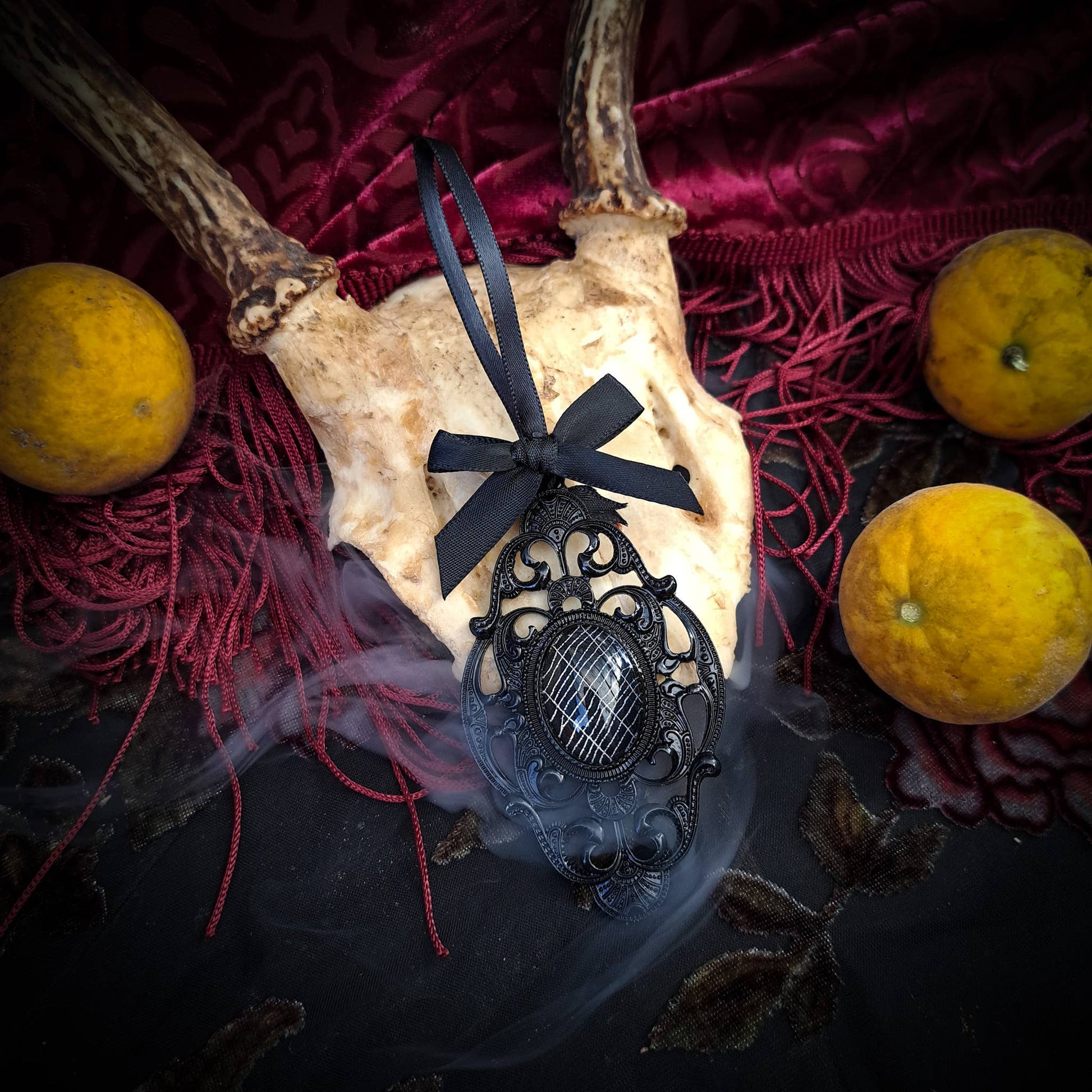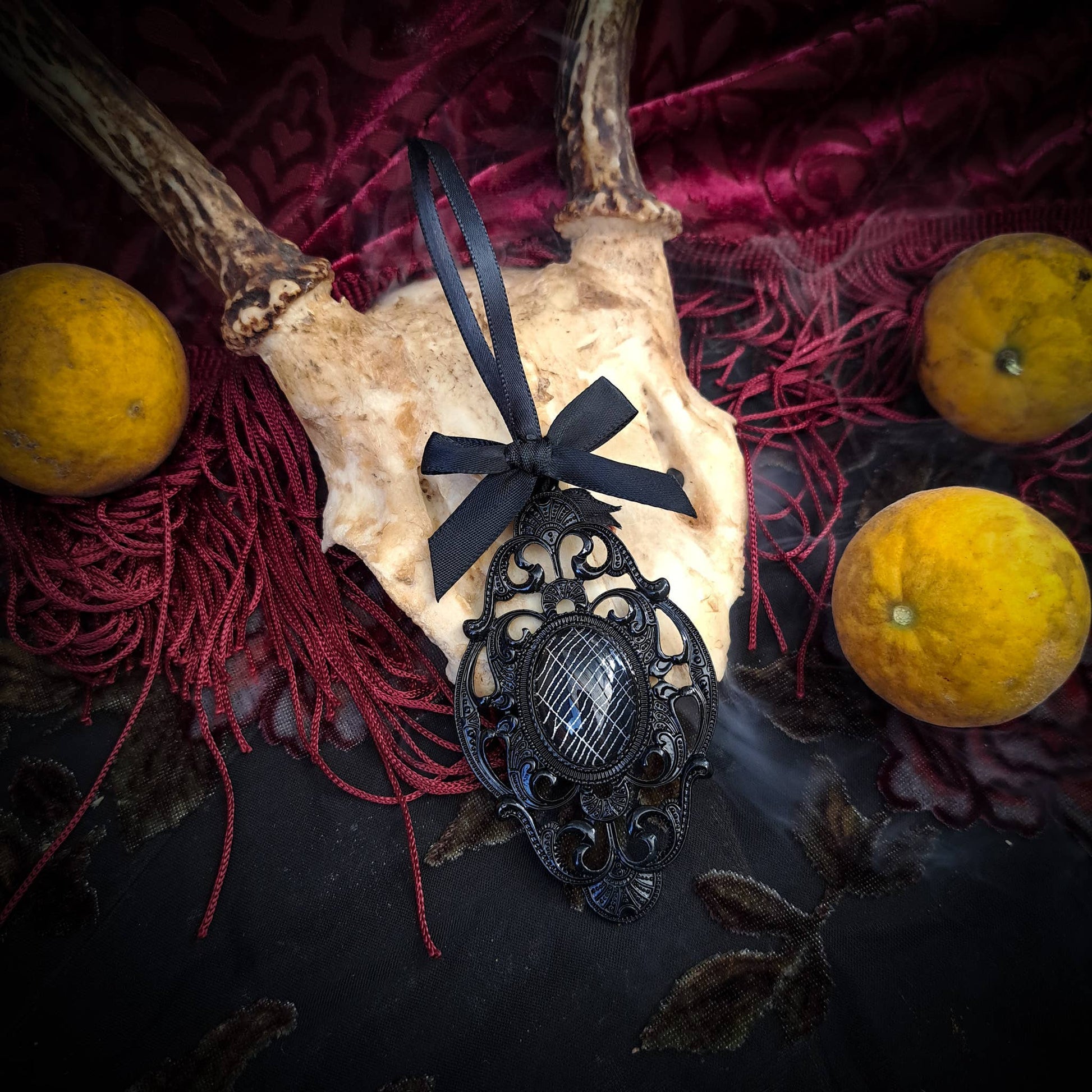 **No Animals are harmed in the making of our jewelry** Spider web set into a Beautiful Filigree bezel in either Black or Antique Bronze.