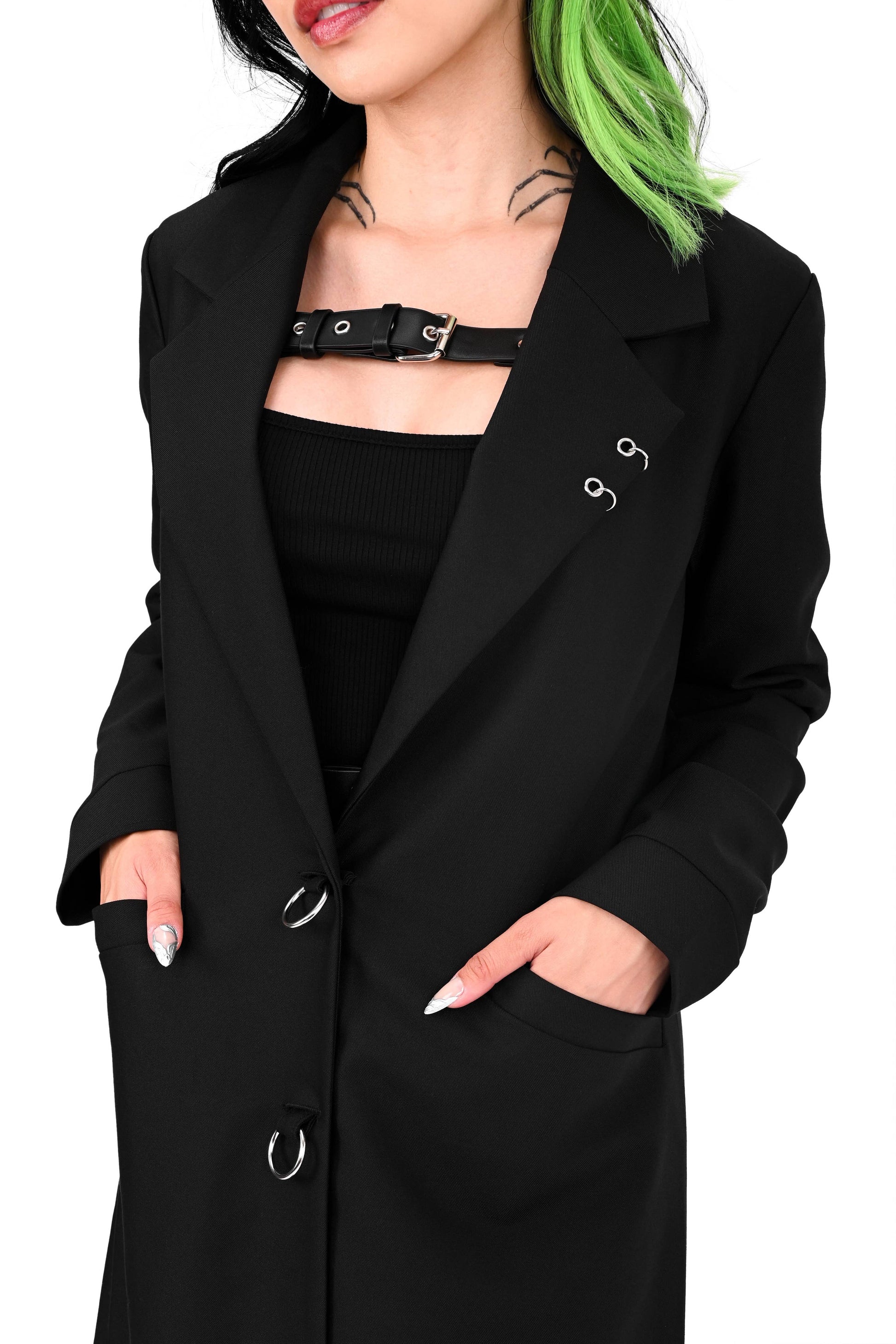 Black trench coat with two mini o-ring piercing details on the left lapel.