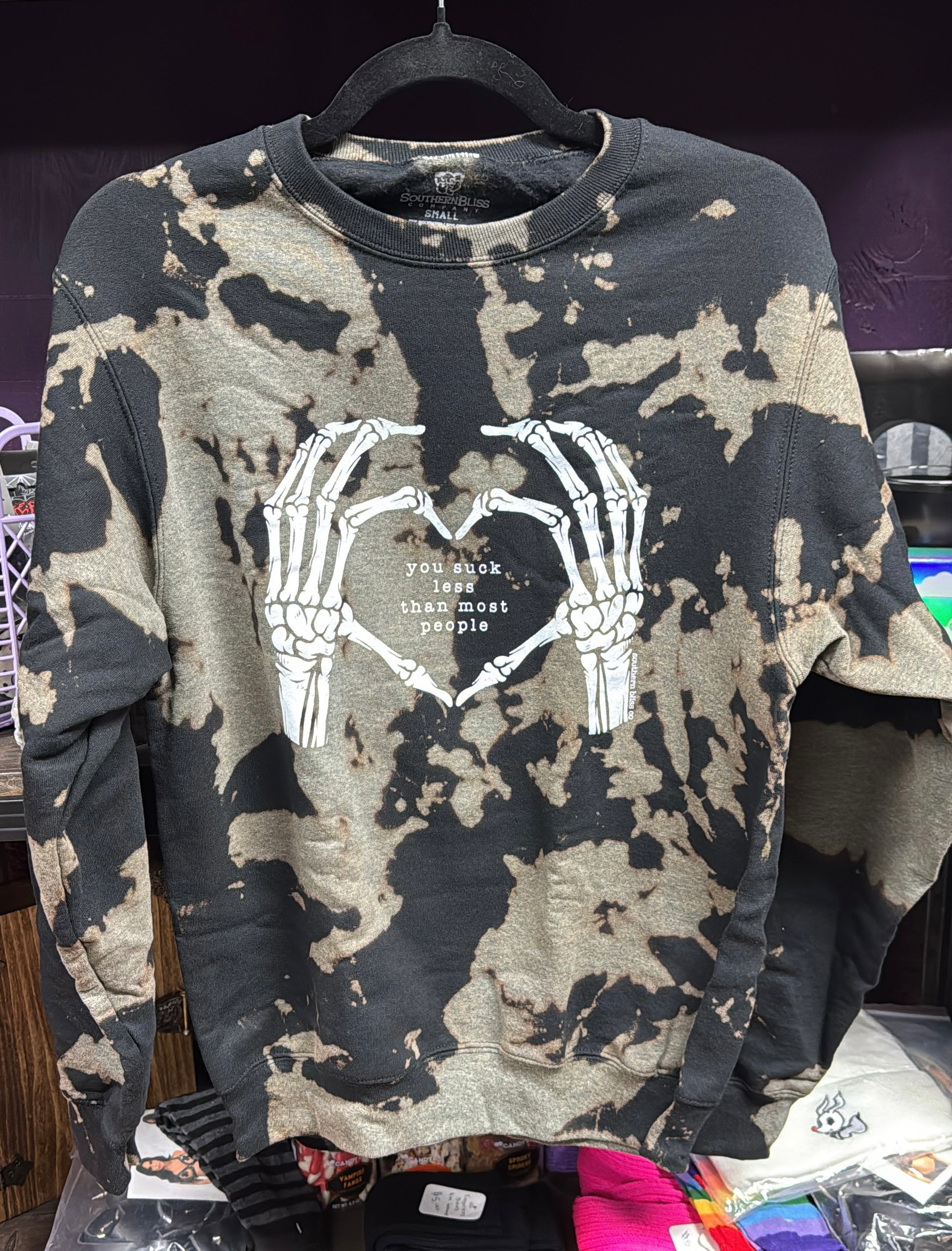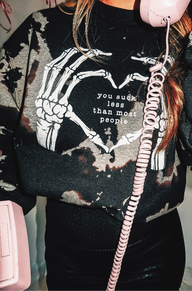 Experience the perfect blend of comfort and style with the You Suck Less Bomba Sweatshirt by Southern Bliss Co. This women's graphic sweatshirt brings together the elements of humor and distressed looks that the brand is known for. The unique screen printed graphics evoke emotions, while the hand-bleached design adds a touch of grunge. Crafted with love, each stitch of this sweatshirt showcases the quality that Southern Bliss Co. prides itself on. Whether you're going for a casual day out or a relaxed day in, this sweatshirt is sure to leave you wanting more of Southern Bliss Co.'s unique products.